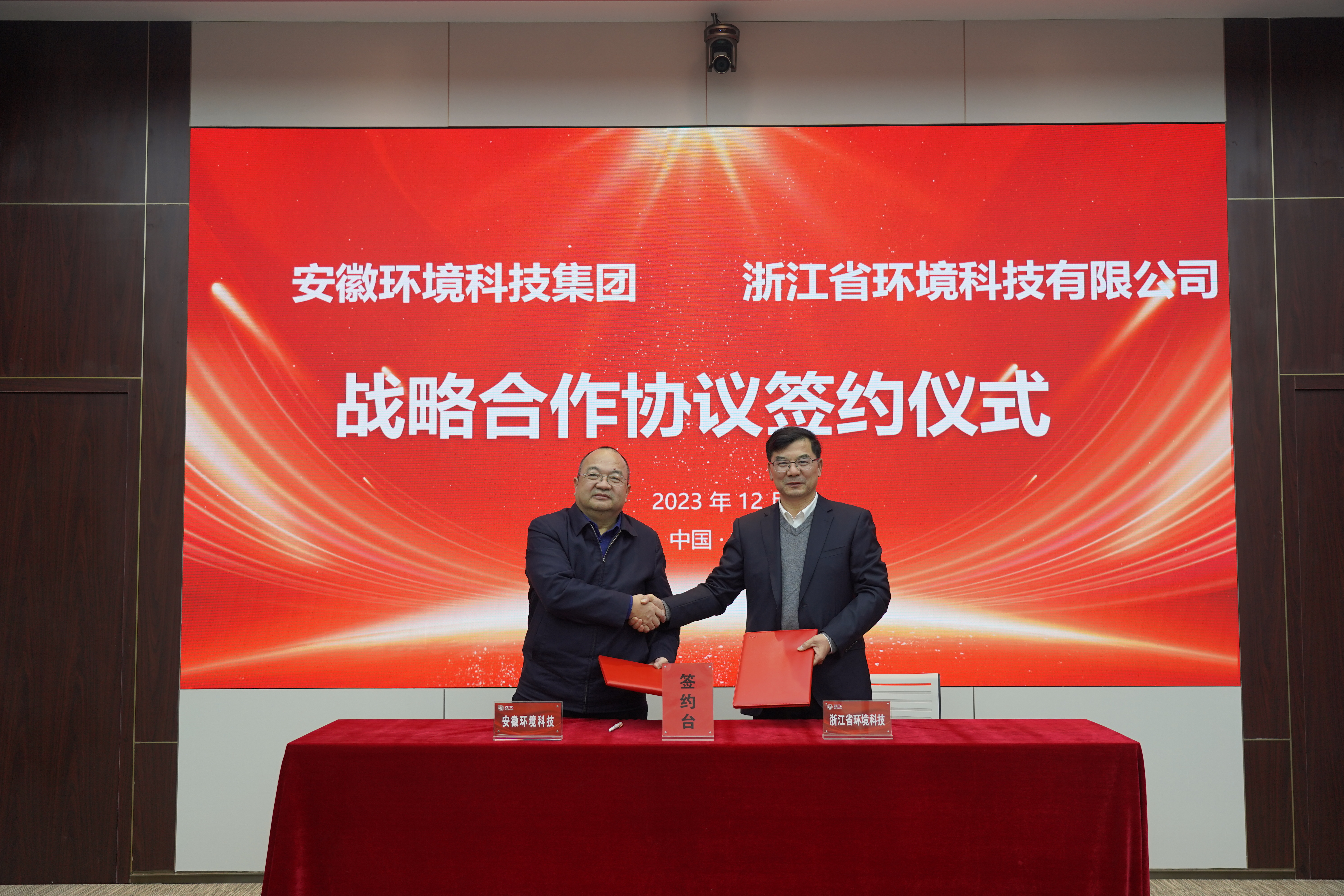 浙江省環(huán)境科技有限公司黨委書記、董事長韋彥斐,安徽環(huán)境科技集團黨委書記、董事長方降龍代表雙方簽訂戰(zhàn)略合作協(xié)議。