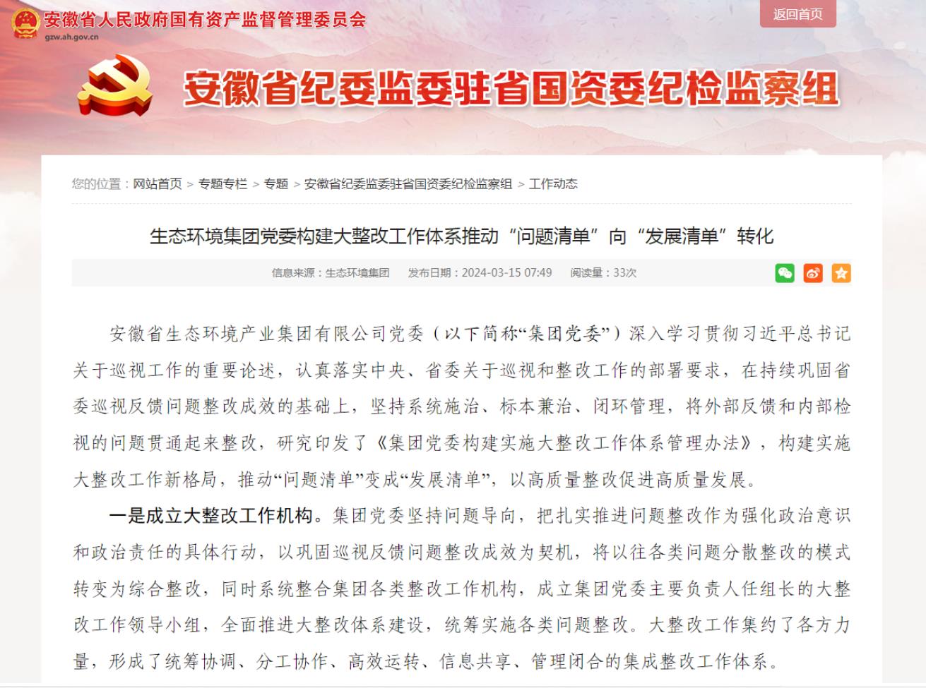 近日,安徽省國資委網(wǎng)站-安徽省紀委監(jiān)委駐省國資委紀檢監(jiān)督組專欄發(fā)布了《省生態(tài)環(huán)境集團黨委構(gòu)建大整改工作體系推動“問題清單”向“發(fā)展清單”轉(zhuǎn)化》,以下為全文。