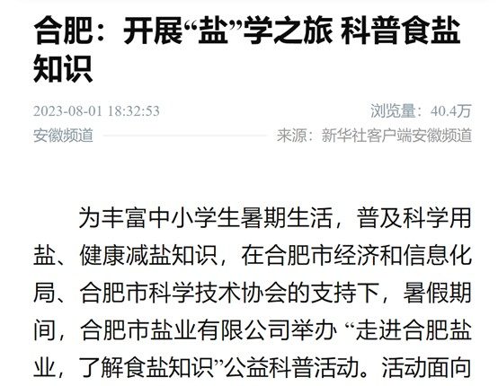2023年7月,合肥鹽業(yè)自1950年成立以來首次對(duì)外開放,面向全市中小學(xué)生,開展“鹽”學(xué)之旅,食鹽科普游活動(dòng),活動(dòng)內(nèi)容包括參觀60年歷史的鐵路專用線、省市食鹽儲(chǔ)備倉庫,食鹽健康科普講座,7月份接待來自國內(nèi)外7所中小學(xué)校170名學(xué)生和家長,8月份已預(yù)約8場食鹽科普游。