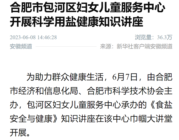 為宣傳科學(xué)補(bǔ)碘、健康減鹽知識(shí),推廣中鹽綠色低鈉鹽,合肥鹽業(yè)在全市積極開展食鹽科普宣傳活動(dòng),2023年以來得到新華社、光明網(wǎng)、安徽新聞網(wǎng)、合肥電視臺(tái)、合肥晚報(bào)等多家媒體報(bào)道,極大提高了合肥鹽業(yè)的知名度和美譽(yù)度,樹立了合肥鹽業(yè)服務(wù)家鄉(xiāng)人的正面形象。