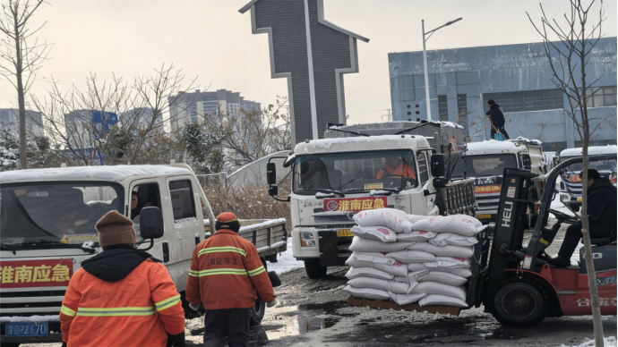 淮南市鹽業(yè)公司與應(yīng)急保障人員協(xié)同作業(yè),搶運融雪鹽▲