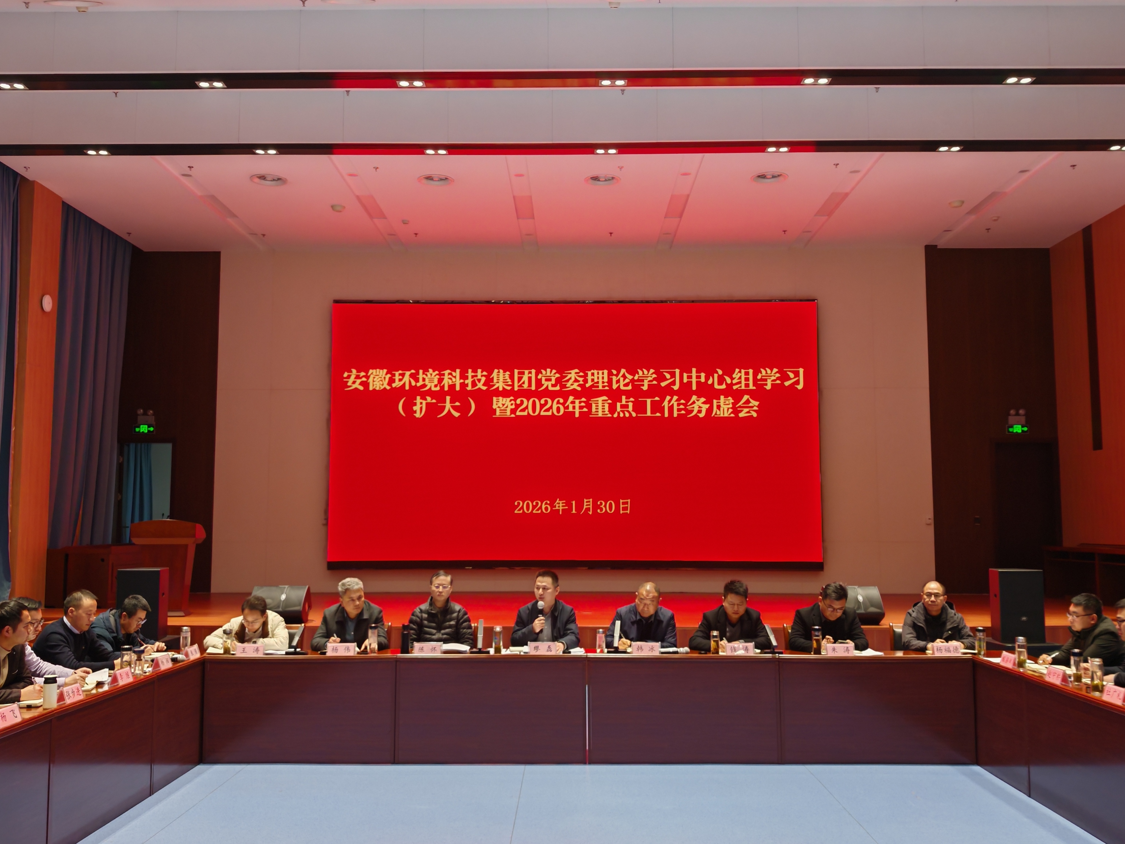 2026年1月30日,安徽環(huán)境科技集團(tuán)黨委理論學(xué)習(xí)中心組學(xué)習(xí)(擴(kuò)大)暨2026年度務(wù)虛會(huì)在合肥召開(kāi)。會(huì)議深入學(xué)習(xí)領(lǐng)會(huì)黨中央及省委、省政府近期系列重要會(huì)議精神,全面分析內(nèi)外部形勢(shì),系統(tǒng)謀劃2026年發(fā)展藍(lán)圖,統(tǒng)一思想、凝聚共識(shí),為在新起點(diǎn)上推動(dòng)公司轉(zhuǎn)型發(fā)展、實(shí)現(xiàn)華麗轉(zhuǎn)身擘畫(huà)了清晰路徑。集團(tuán)黨委書(shū)記、董事長(zhǎng)繆磊出席會(huì)議并講話(huà),黨委副書(shū)記、總經(jīng)理韓冰作年度形勢(shì)任務(wù)分析報(bào)告。集團(tuán)領(lǐng)導(dǎo)班子成員、總經(jīng)理助理、首席研究員、各部門(mén)負(fù)責(zé)人、各子(項(xiàng)目)公司負(fù)責(zé)人參加會(huì)議。